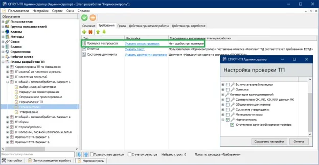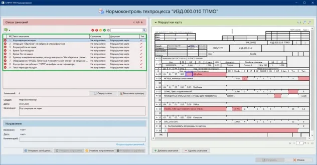 «Нормоконтроль» обеспечивает автоматическую проверку технологического процесса, получение списка замечаний и организацию взаимодействия нормоконтролера с разработчиком ТП для исправления замечаний с целью получения безошибочного ТП.