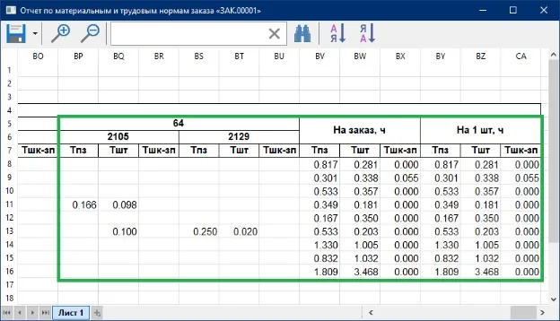 Аналитика. Отчет по материальным и трудовым нормам заказа.