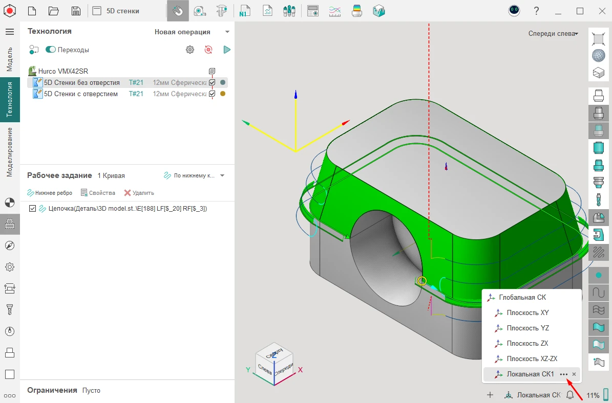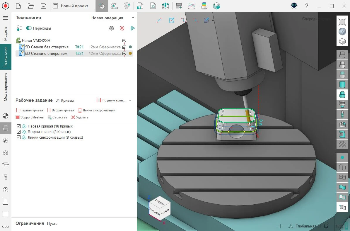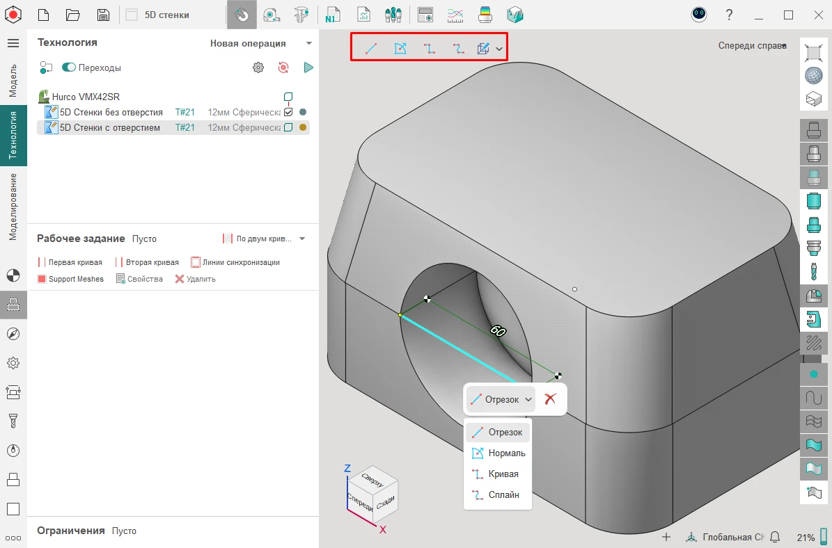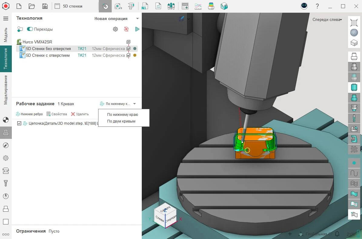 Для операции «5D Стенки» добавили возможность задать рабочее задание по двум кривым. Работает, когда у вас есть разрывы, например, отверстие. Чтобы обработать такую деталь необходимо выбрать в качестве рабочего задания опцию «По двум кривым».