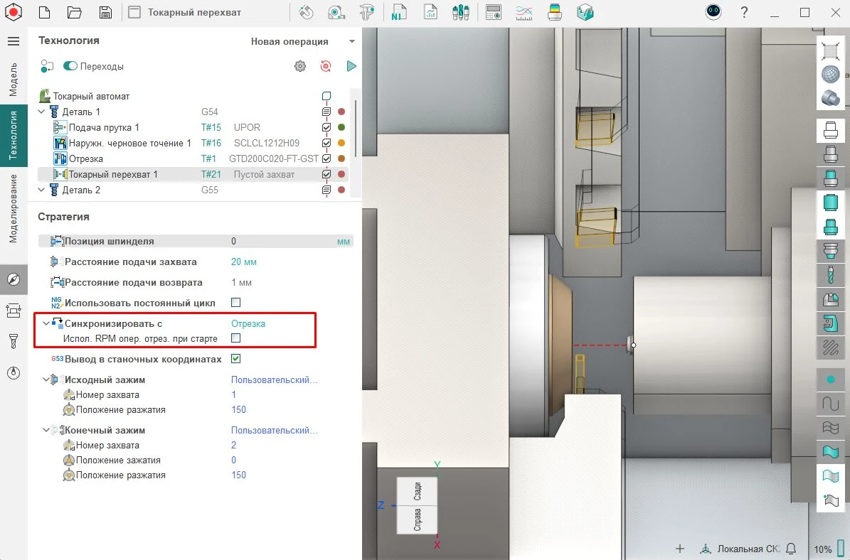 Теперь для совместимости работы ранее разработанных постпроцессоров для токарных автоматов швейцарского типа в операции «Токарный перехват» нужно включить галочку «Использовать скорость вращения шпинделя» из предыдущей операции «Отрезка», если перехват синхронизирован с ней. По умолчанию для отладки новых постпроцессоров параметр будет выключен, чтобы можно было задать собственную скорость шпинделя для токарного перехвата.