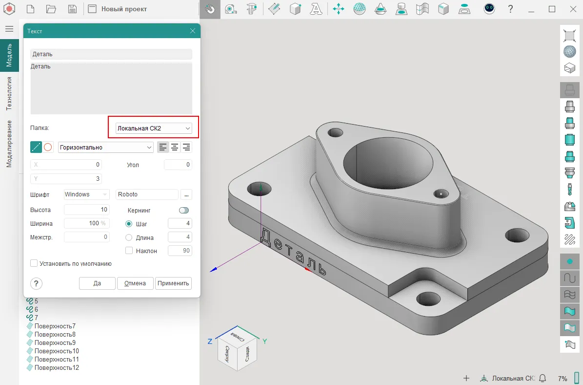 По умолчанию при работе с опцией «Текст» надпись для маркировки деталей создается в текущей локальной системе координат. В этом обновлении добавили возможность выбора системы координат, в которой можно создать текст. Например, создаем ЛСК на одной из граней детали, и указываем её, чтобы сразу правильно разместить нужный текст.