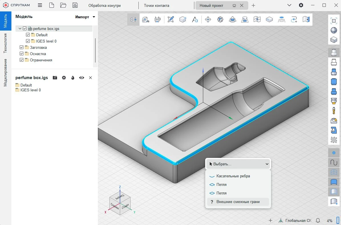 Если сначала выделить замкнутый контур, а затем снова кликнуть по грани контура правой кнопкой мышки, то в меню выбора элементов появится пункт «Изолированные поверхности». Теперь так можно выбрать все поверхности внутри выделенного замкнутого контура, например поверхности профильного кармана.