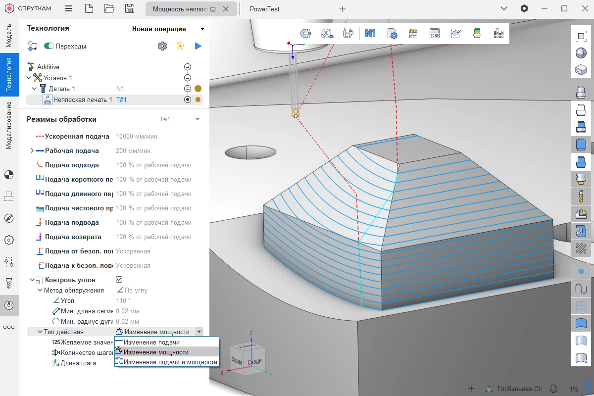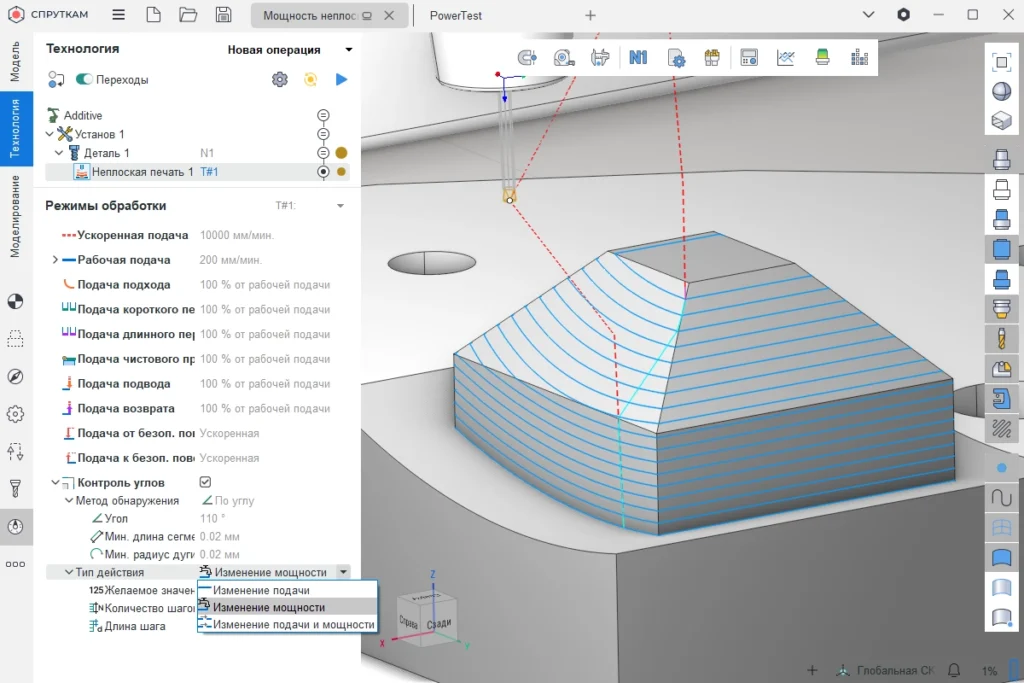 В этом обновлении параметр Мощность стал доступен для операции Неплоская печать. Теперь этот параметр поддерживают две операции: 5D Наплавка и Неплоская печать. Также мы добавили возможность регулировать значение мощности в процентах от заданной при наплавке в углах.