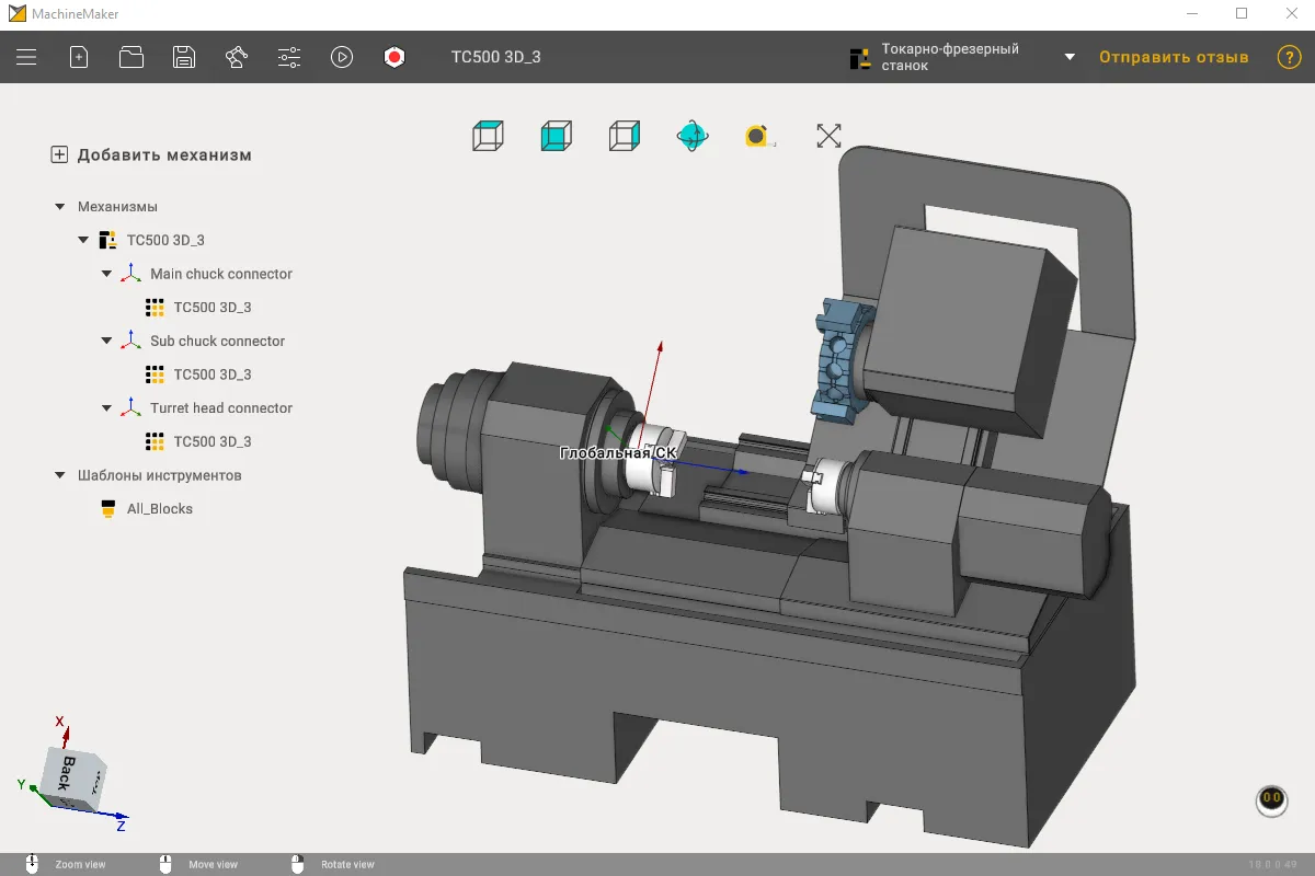 Теперь машинмейкер поддерживает токарно-фрезерные станки. Можно собрать станок с одним револьвером и подвижной пинолью или контршпинделем.