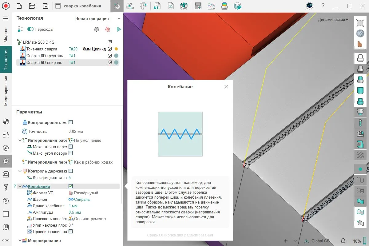 Опцию можно использовать для полировки или зачистки сварочных швов. Колебание доступно для операций Морфинг между двумя кривыми, 5D по поверхностям, 6D контур, Сварка 6D.