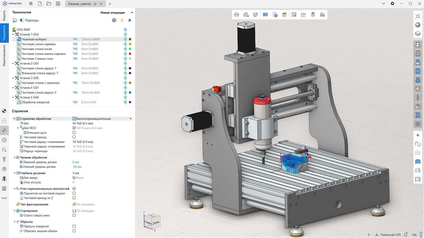 Задаем ноль заготовки, добавляем операцию черновой обработки, редактируем настройки инструмента, режимы резания и выбираем стратегию обработки